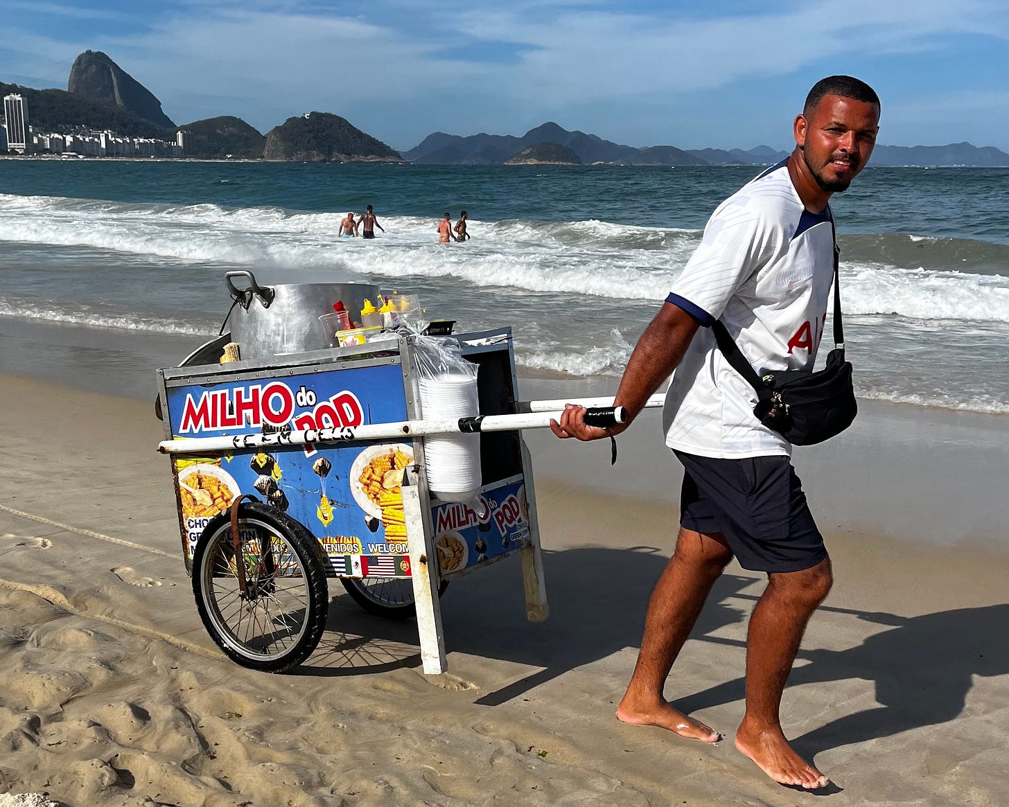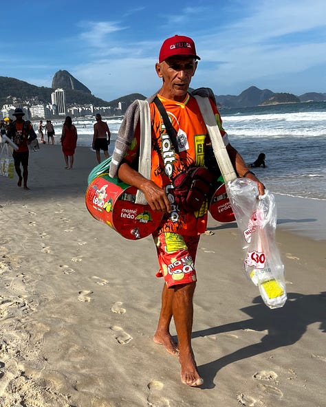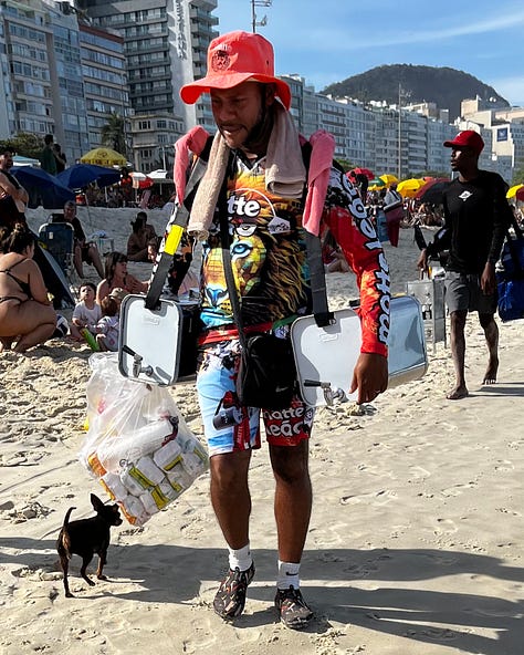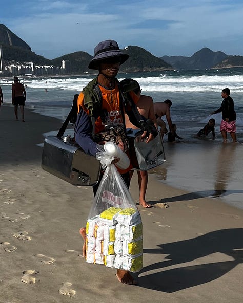 You briefly become the man who pulls his cauldron of steaming corn through the sand on his cart. The woman who braids other people’s hair with extensions. The man who sells empanadas from a heavy basket dangling from his arm. The woman who sells her açai smoothies topped with a festival of granola and condensed milk.