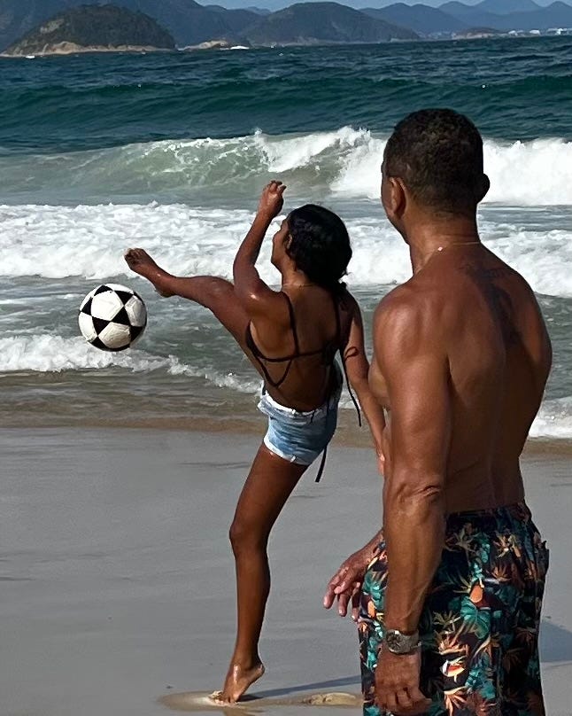 You dodge the footballs that small groups of mostly young men are ankling, kneeing, heading, and chesting between them. Futevôlei is the name of their game and you play it with gusto.
