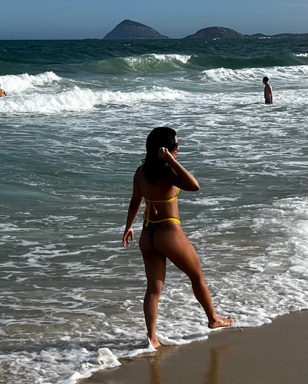 You sit on the sand, letting the breeze stroke your skin until the tide comes up, the rest of Rio de Janeiro arrives, and every inch of the dry beach is taken up by umbrellas and folding chairs. Prop planes with commercial messages fly by to keep you from forgetting about that other world out there. In the distance, a tanker heads toward the open sea.