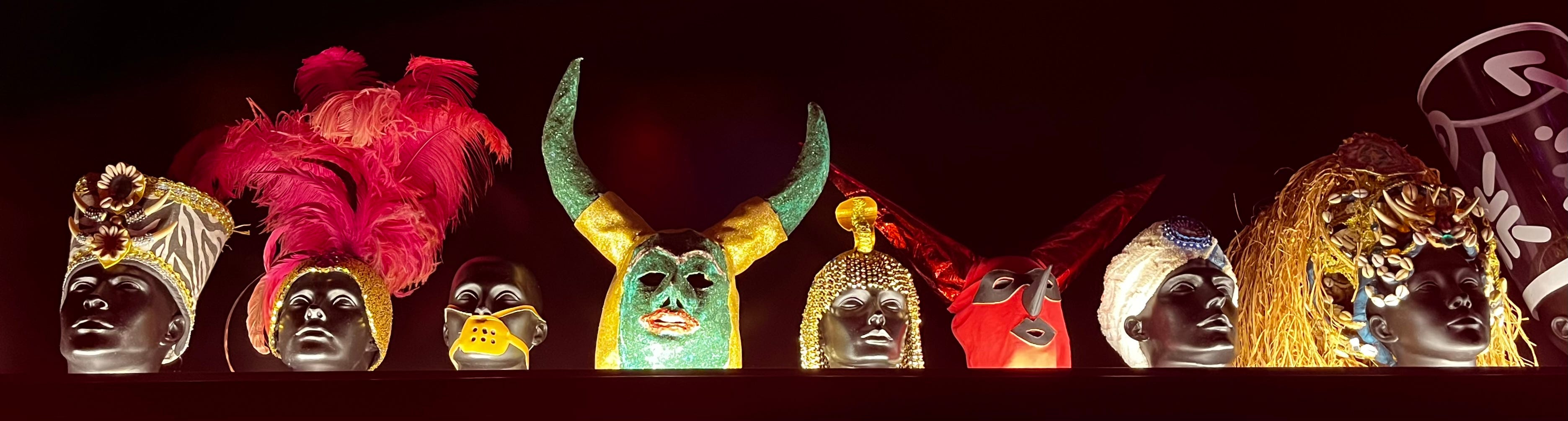 Unimpressed by the rather flat representation of the larger-than-life festivities, we reach the top floor where we enter a darkened space. A dance floor is bordered by a huge screen. Shelves hold masks, hats, and other carnival paraphernalia. We’re alone save for the museum attendant, who invites us to dress up. This is our time to shine.