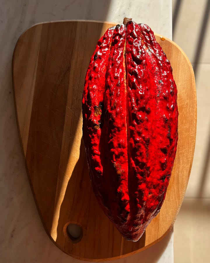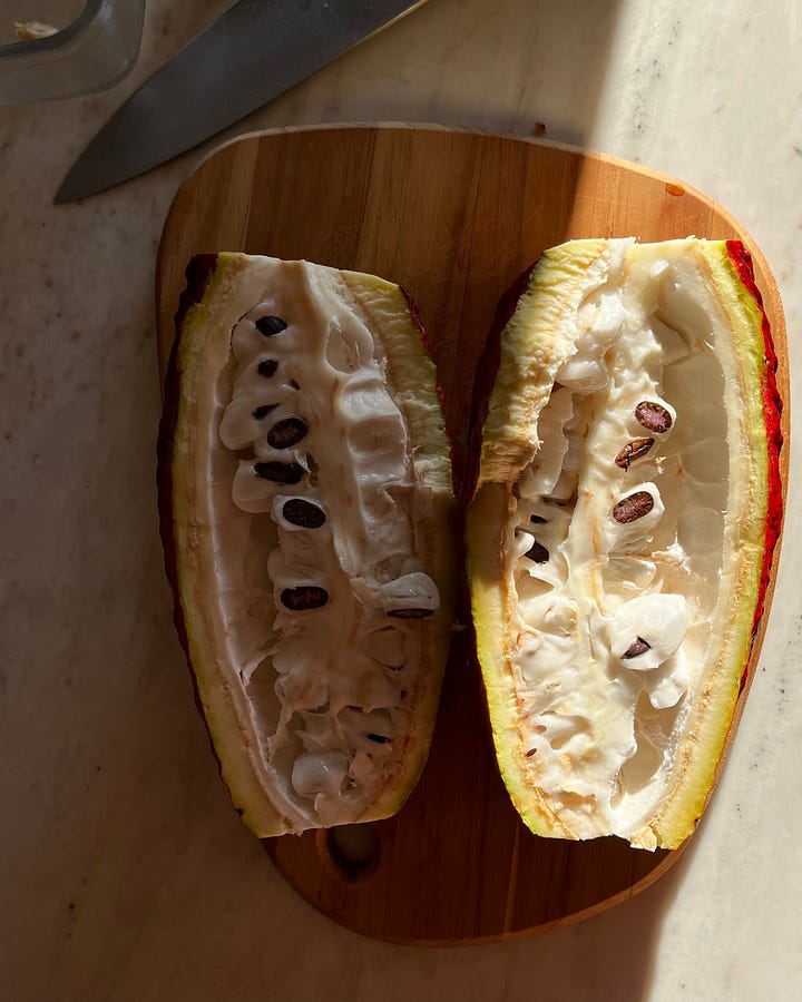 The white cacao flesh is mildly sweet and flowery like lychees. The seeds aren’t as intense as finished chocolate, because they haven’t been fermented and roasted yet. But flesh and seeds together make magical bursts of flavor.