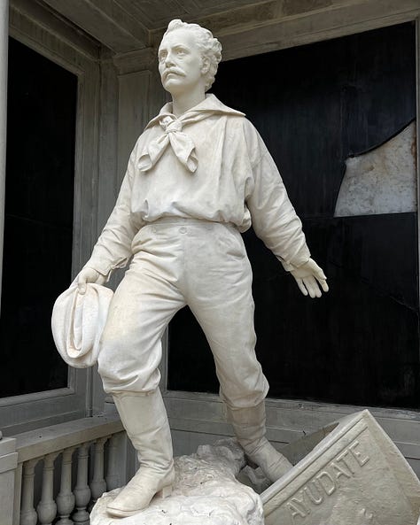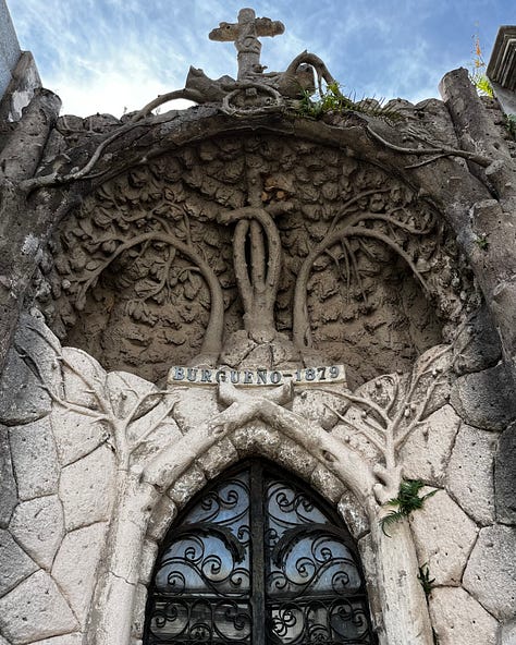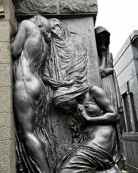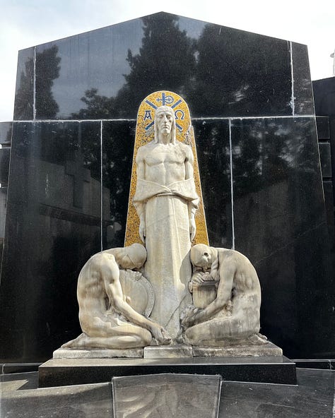 Daniel and I meander, stopping at mausoleums and funerary monuments that speak to us. As we admire the art and take pictures we openly wonder about the privileged lives of the people buried beneath all this expensive stone. Plaques give away titles. Statues indicate age, profession, and character. I’m reminded of how I used to wander Cimitière du Montparnasse in Paris whenever I needed inspiration. Stories are for the taking among the dead.